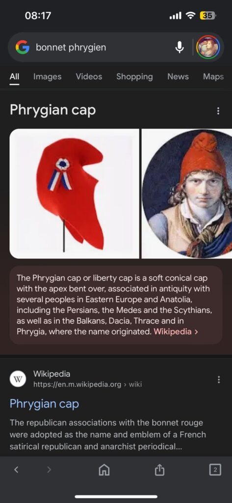 Laura, quien vivió varios -o muchos- años en la «France», me comentó algunas cosas de los gorros frigios, incluyéndome algunos print screen de diversas fuentes (que aquí incluyo directamente).